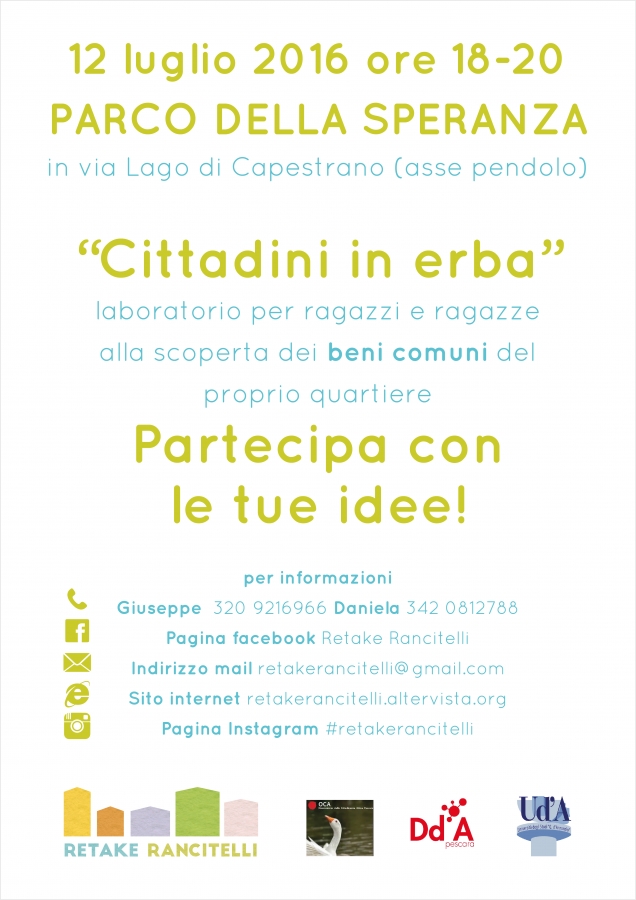 Nello specifico, è stato avviato martedì 5 luglio un ciclo di cinque incontri in cui conoscere meglio il quartiere Rancitelli, partendo dalle sue positività e puntando alla tutela del suo paesaggio urbano e rurale da parte dei residenti. Le attività si svolgono all'interno dei parchi di Rancitelli, e fanno parte di un cartellone di eventi ben più ampio a cura dell'Amministrazione Comunale e di altre associazioni operanti sul territorio.