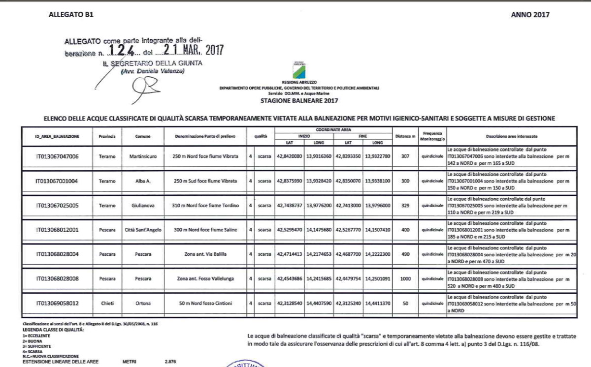 questo il commento del Forum Abruzzese dei Movimenti per l'Acqua che ha elaborato i dati della Delibera di Giunta Regionale (quest'anno la numero 124/2017) che contiene la classificazione delle acque di balneazione della regione.