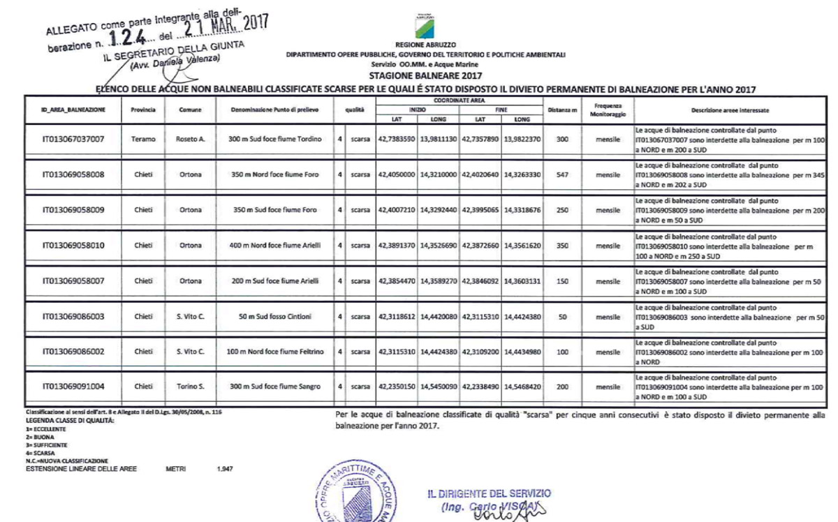 Invece otto tratti saranno chiusi alla balneazione per l'intero 2017. Alleghiamo direttamente la tabella tratta dalla Delibera regionale.