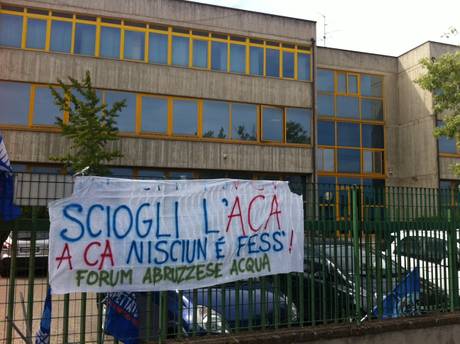 Puntuale, come annunciato, il sit-in a Pescara degli attivisti del Forum dei Movimenti per l'Acqua davanti alla sede dell'Aca, in concomitanza della riunione dei comuni soci per discutere delle sorti del Cda, alla luce delle vicende giudiziarie che hanno coinvolto il presidente.