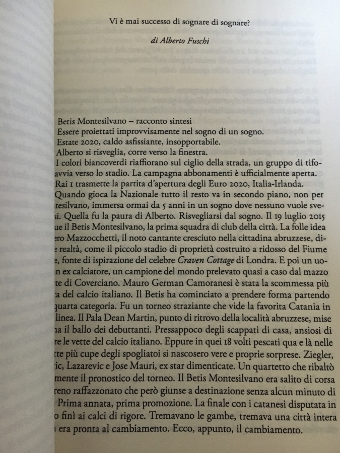 La storia del Betis Montesilvano, tratta dal libro “Leicester d’Italia” del giornalista Alberto Fuschi, è stata selezionata tra i racconti vincitori del concorso letterario “Racconti dall’Abruzzo e dal Molise 2019” e pubblicata nel libro della casa editrice Historica Edizioni. La premiazione con tutti gli autori si è tenuta al Best Western Villa Maria di Francavilla lo scorso 15 dicembre. La città di Montesilvano entra per la prima volta nelle antologie pubblicate da una casa editrice. La storia del Betis Montesilvano, come spiegato dall’autore durante l’evento, tratta il genere sportivo/sociale/turistico. La fantasiosa squadra biancoverde di Montesilvano si offre come soluzione alle carenze culturali attraverso la domenica sportiva mai esistita nella provincia pescarese. Verranno coinvolti personaggi e luoghi noti alla località abruzzese come il Pala Dean Martin, Porto Allegro, il Mulino (Riverside) e il cantante Piero Mazzocchetti (il presidente della squadra). Una città fantastica che vivrà all'improvviso la favola del mitico Leicester di Claudio Ranieri. Il popolo montesilvanese finalmente unito grazie alla passione calcistica che si consuma nel piccolo e caloroso "Stadio Saline" costruito sull'omonimo fiume proprio come l'affascinante Craven Cottage di Londra. Nella fantasia dell'autore la struttura è situata al posto del neo Ponte Adriatico. Alberto Fuschi, giornalista e blogger della sua testata giornalistica Spettacolo Italiano, ha presentato il suo libro “Leicester d’Italia” al sindaco di Montesilvano, Ottavio De Martinis. Lo scorso maggio ha esposto la sua opera al Villaggio Letterario presso il Centro Universo. “Racconti dall’Abruzzo e dal Molise 2019” sarà in vendita nelle librerie abruzzesi e molisane (con distribuzione Libro.co), sul sito di Historica, alle principali fiere della piccola e media Editoria cui parteciperà l’editore e sui principali book-stores online.