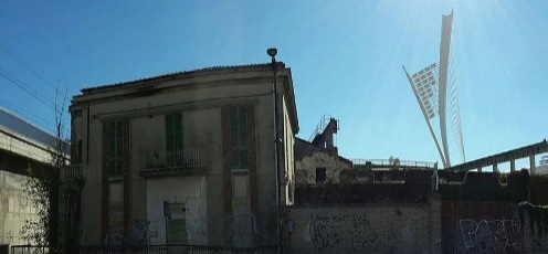 Il bastione all'interno del terrapieno FS in una mappa del XIX sec. - Il doloroso confronto tra prima e dopo Chiusura e abbattimento, dopo mezzo secolo di degrado, del tratto finale dell’asse attrezzato. In particolare, il nuovo asse dovrà terminare allo svincolo del Ponte Flaiano, ove la viabilità di supporto – opportunamente potenziata – permetterà agli automobilisti di raggiungere agevolmente il centro-nord della città, la stazione centrale, il parcheggio centrale delle aree di risulta e, a sud, la stazione di Portanuova FS, il tribunale, l’università e lo stadio. Inoltre, l’apertura di via Conte di Ruvo – via Marco Polo a doppio senso creerà una direttrice veloce per penetrare nella zona costiera di Portanuova e, da lì, al porto. L’abbattimento controllato del tratto finale dell’asse attrezzato sottrarrà finalmente la golena sud e l’intero centro storico al degrado ed alla ferita per gli occhi perpetuatasi ogni giorno dalla sua costruzione negli anni ’70, quando la civiltà dell’automobile era al suo apice. La liberazione della Golena Sud permetterà la riqualificazione delle sponde del fiume. Queste potrebberotornare, almeno in parte, verdi.