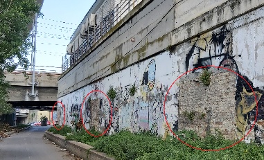 Lo stabile abbandonato (sx) ed il muro intatto del Bastione S. Vitale al suo interno (dx)