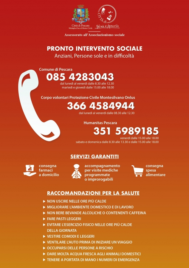 Queste condizioni climatiche possono rappresentare un rischio per la salute della popolazione, in particolare per le categorie fragili e per coloro che soffrono di patologie preesistenti. La città di Pescara da alcune settimane ha attivato il servizio di pronto intervento Emergenza caldo.
