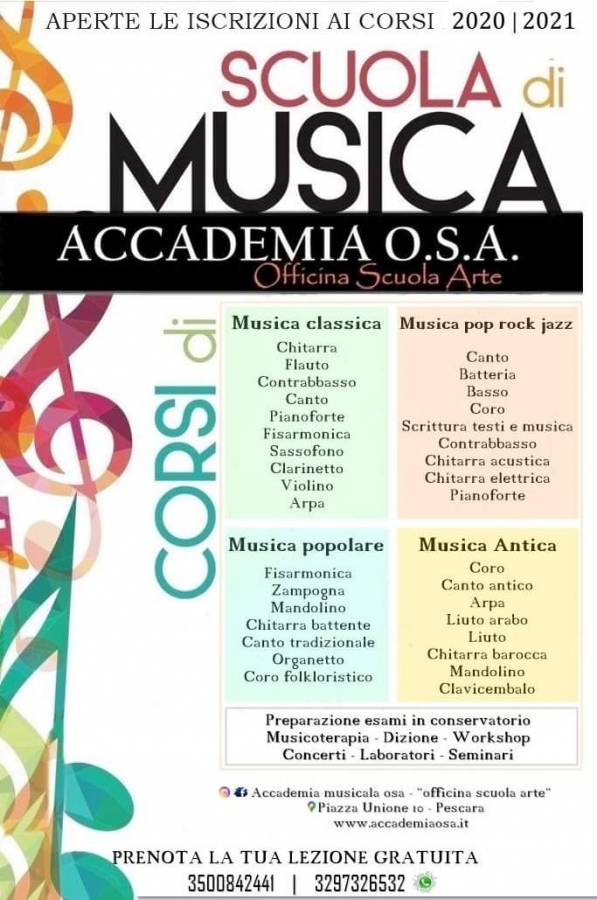 Settembre tutti a scuola anche di musica. Sono infatti partite oggi le iscrizioni ai corsi per l’anno 2021/22 dell’Accademia O.S.A - Officina Scuola Arte con sede a Pescara in piazza Unione, 10.