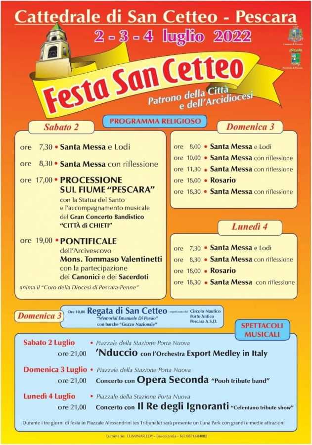 Al via oggi, sabato 2 fino al 4 luglio la Festa di San Cetteo, patrono di Pescara e dell'Arcidiocesi. Ecco il programma: