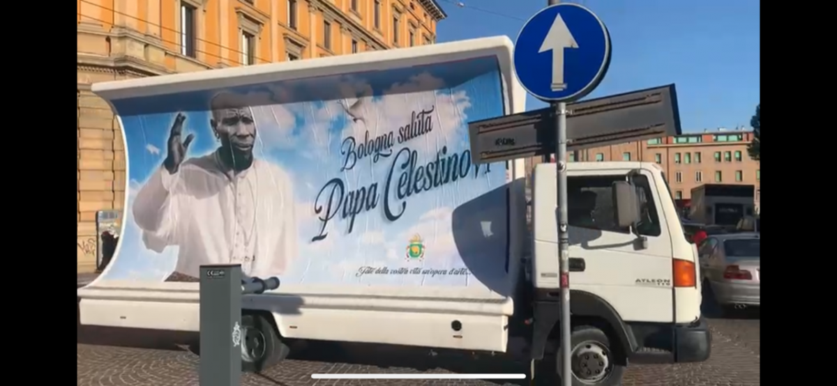 Un viaggio artistico che lancia un messaggio con l’innovativo stile di Pep Marchegiani. Il futuribile papa nero Celestino VI arriva a Bologna e per mostrarsi alla città si muove su alcuni camion vela tipicamente usati per le campagne pubblicitarie.