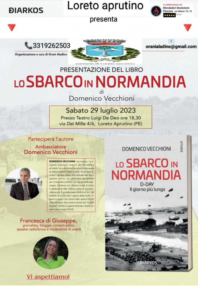 “Sono felicissimo di presentare il mio libro a Loreto Aprutino – afferma l’ambasciatore Domenico Vecchioni – perché mi dà modo di visitare il borgo medievale. Sono altrettanto contento e soddisfatto del coinvolgimento del sindaco e dell’amministrazione comunale. Lo sbarco in Normandia è un libro attraverso il quale, nonostante parla di una di momenti storici più noti del secondo conflitto mondiale, cerco di affrontare l’argomento in modo personale all’interno di quella che è poi la mia attività e cioè la divulgazione storica; mi piace poter condividere con il lettore le stesse sensazioni di curiosità e interesse nello scoprire avvenimenti poco noti e nel riscoprire eventi molto popolari proprio come il D-Day. Il mio obiettivo – prosegue Vecchioni - infatti è di far conoscere la storia non attraverso un testo universitario, bensì come un libro da leggere con diletto come fanno i grandi divulgatori quali Indro Montanelli. Lungi da me paragonarmi a lui, ma è certamente per me un punto di riferimento nel raccontare la storia”.