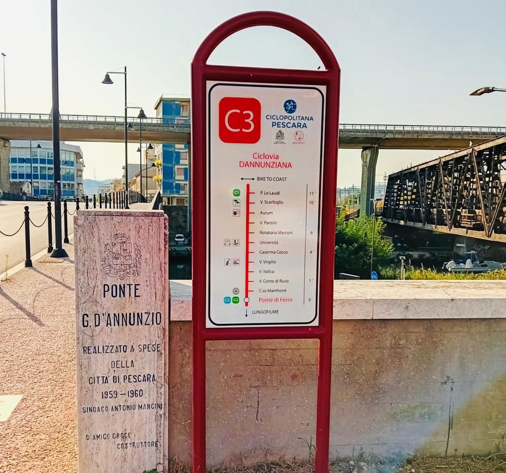 Tabelle con diverse colorazioni indicano i diversi percorsi: blu petrolio per il tratto urbano della Bike to coast che collega Pescara a nord con Montesilvano e a sud con Francavilla, rosso per la ciclovia Dannunziana che ha tra gli attrattori la zona uffici di via Conte di Ruvo, l'Aurum e l'università , verde per la Greenway del lungofiume, verde acceso per la ciclovia mare-università , turchese per la ciclovia dei parchi e fucsia per la circonvallazione-Pendolo. Tutti i percorsi sono poi integrati proprio con la ciclabilità regionale che porta verso San Salvo e Martinsicuro e anche nei centri vicini, con relativa indicazione delle distanze chilometriche da percorrere.
