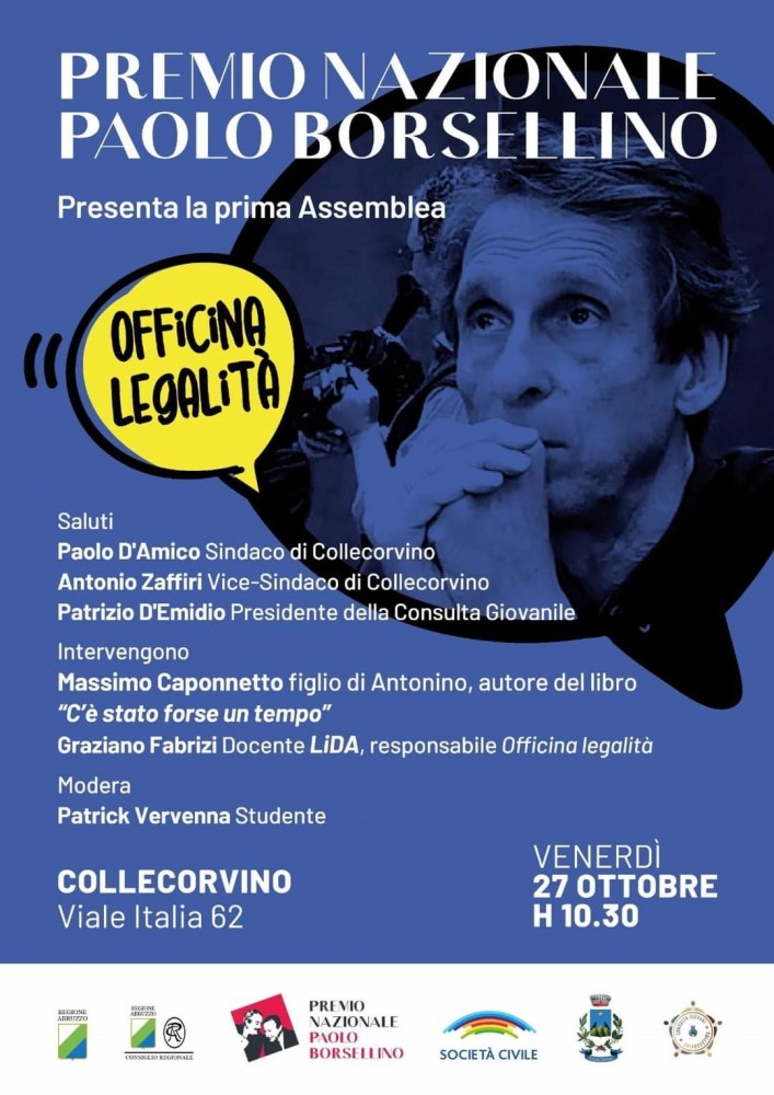 Il Comune di Collecorvino sta per vivere un momento di grande crescita e formazione per piccoli e grandi: venerdì 27 ottobre alle 10.30 presso stabile Palmucci in viale Italia 62, ci sarà infatti la 'Prima Assemblea' di Officina della Legalità del Premio Nazionale Paolo Borsellino.