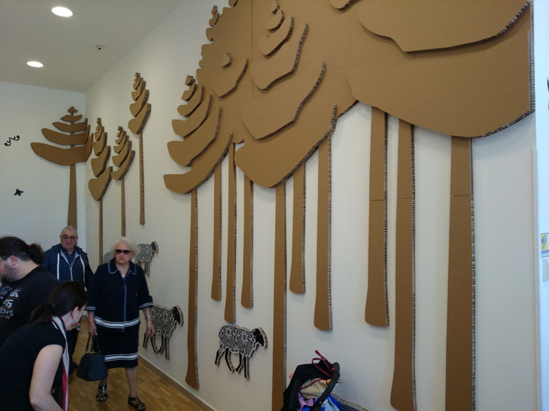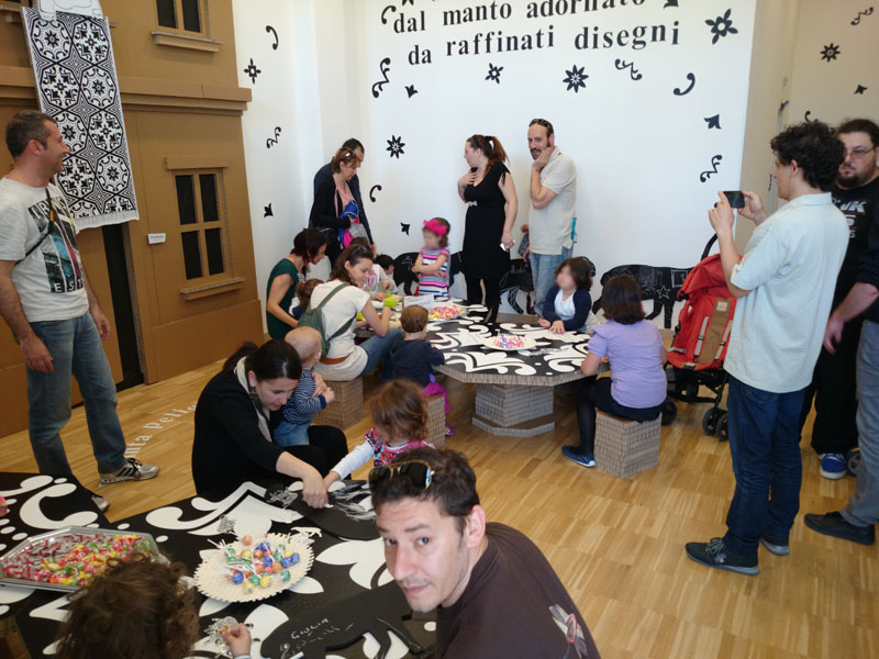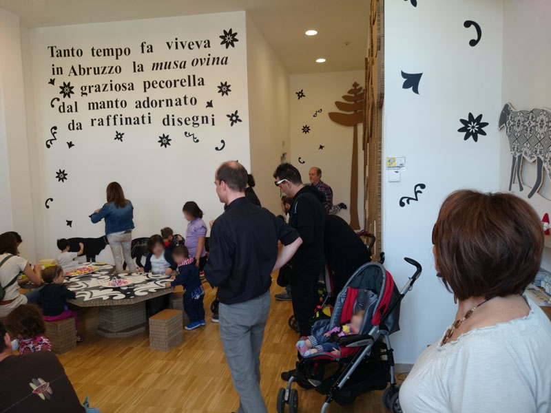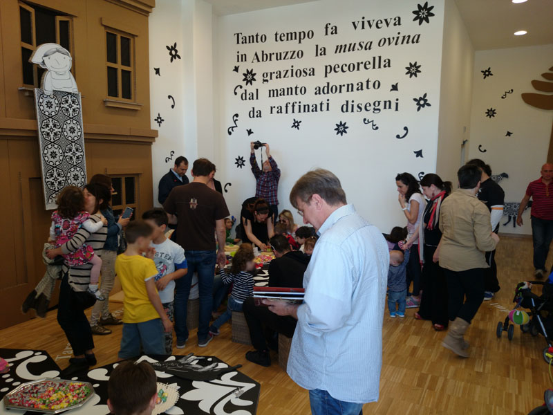 Le "pecore lavagna" della parete "dei decori" e gli arredi riferiti all'immaginario della fiaba, divengono gli strumenti per una creatività che di riferisce giocosamente alla cultura abruzzese.