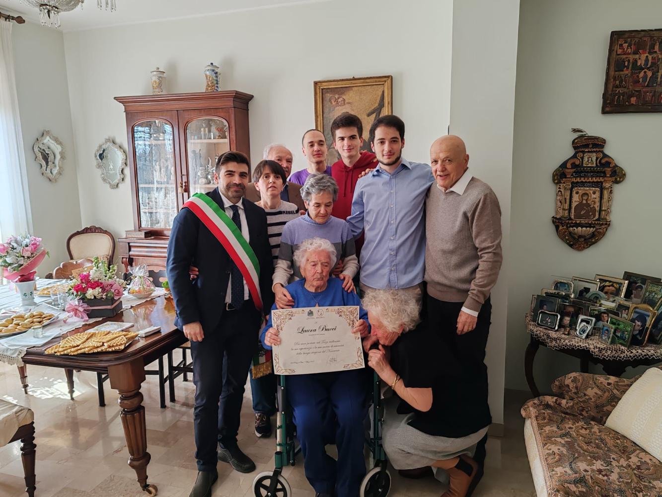 E' stato l'assessore Cristian Orta a fare gli auguri del Comune e della città a Laura Bucci, che ieri ha compiuto 100 anni. Fiori e pergamena ricordo per la centenaria che è stata al centro di una bella giornata di festa. Nata a Gamberale nel 1925, Bucci è rimasta orfana di padre a 13 anni e ha vissuto l'esperienza drammatica della seconda guerra mondiale (con il fronte proprio a Gamberale).