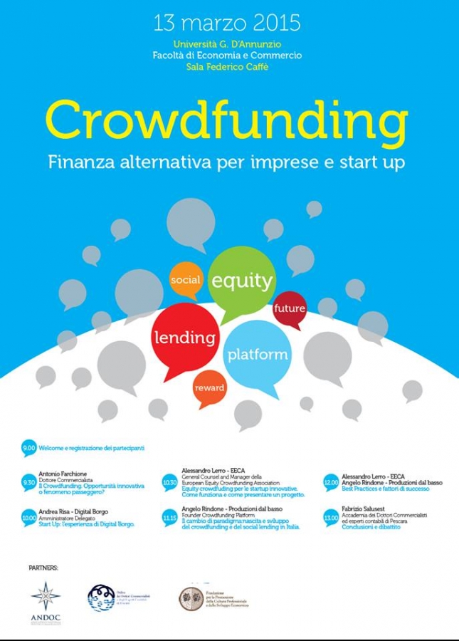 Il cronoprogramma – dopo la registrazione dei partecipanti e i saluti, è prevista una ‘intro’ sulle forme alternative di finanziamento dei progetti di impresa con l’intervento di Antonio Farchione, professore alla “D’Annunzio”, cattedra di Marketing. Subito dopo, Andrea Risa, amministratore delegato di Digital Borgo, rete di imprese digitali e incubatore di imprese; poi l’avvocato e manager della EECA (European Equity Crowdfunding Association) Alessandro Lerro; Angelo Rindone, fondatore di “Produzioni dal basso”, prima piattaforma italiana di crowdfunding;  successivamente, la presentazione di una case history in italia e nel mondo e poi le conclusioni di Fabrizio Salusest, presidente dell’Accademia Commercialisti di Pescara. A presiedere i lavori sarà Venanzio Paciocco, commercialista e membro della stessa Accademia.