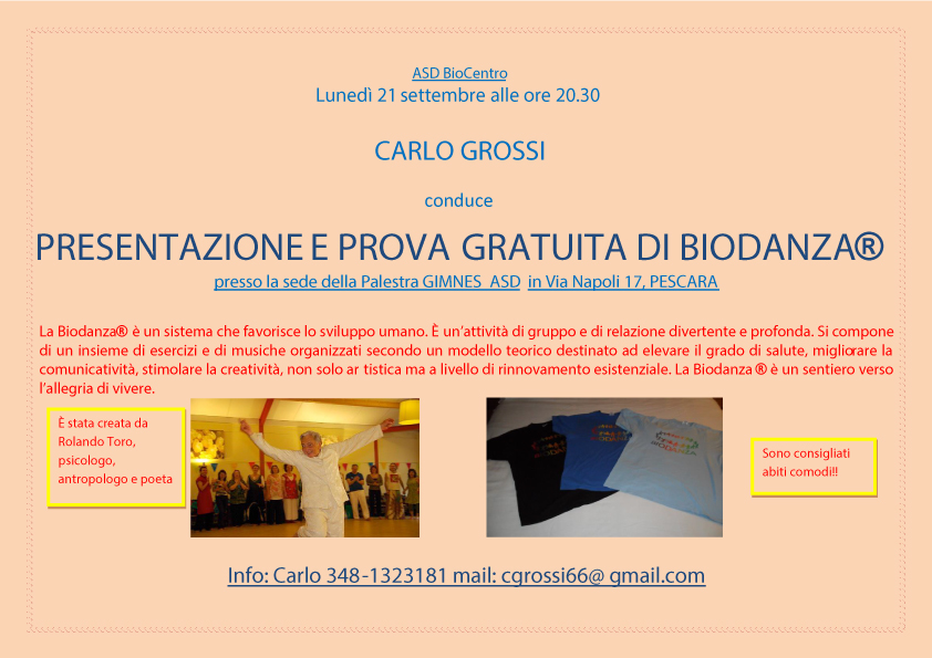 A Pescara nei giorni di lunedì 21 e 29 settembre presso la palestra GIMNES ASD di via Napoli 17, alle ore 20,30 ci sarà una presentazione ed una lezione di prova gratuita di Biodanza