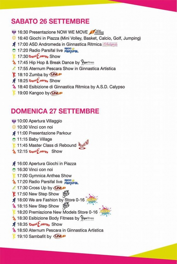 Si svolgerà sabato 26 e domenica 27 settembre prossimi in piazza Salotto l'edizione 2015 dell'evento NowWeMove, giornate di adesione alla campagna europea contro la sedentarietà infantile, del Comune di Pescara, in collaborazione con Unicef, Uisp e Pubblievents.