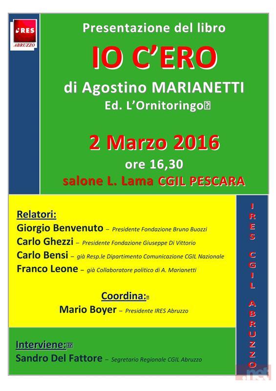 A poco più di un mese dalla scomparsa di Agostino Marianetti, avvenuta lo scorso 21 gennaio a Roma, domani, mercoledì 2 marzo, alle ore 16:30, presso il salone L. Lama della CGIL di Pescara, verrà presentato il suo libro, IO C'ERO.
