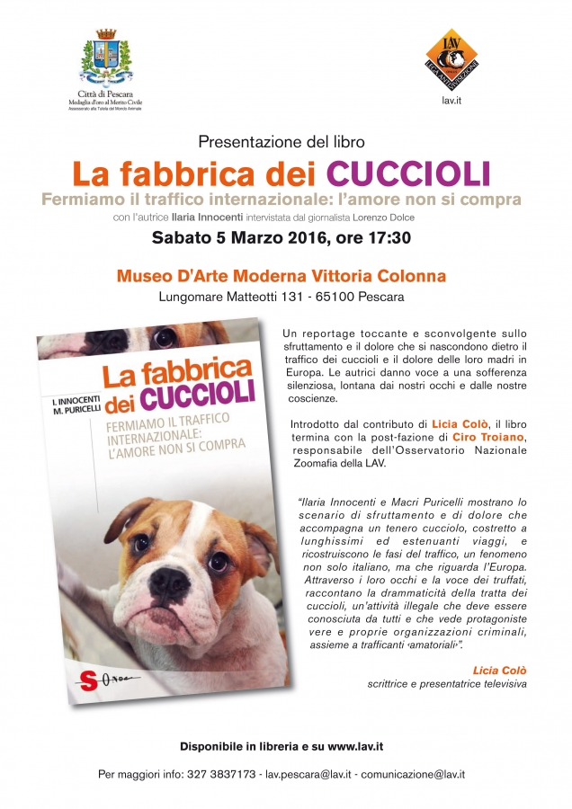 La LAV di Pescara presenta il libro La fabbrica dei CUCCIOLI Fermiamo il traffico internazionale: l'amore non si compra, a cura della giornalista Macri Puricelli e di Ilaria Innocenti, responsabile nazionale del settore Cani e Gatti Lav, che sarà intervistata, nell'occasione, dal giornalista Lorenzo Dolce. L'appuntamento è per Sabato 5 marzo, alle ore 17:30, presso il Museo d'arte Moderna Vittoria Colonna in Lungomare Matteotti 131 a Pescara.