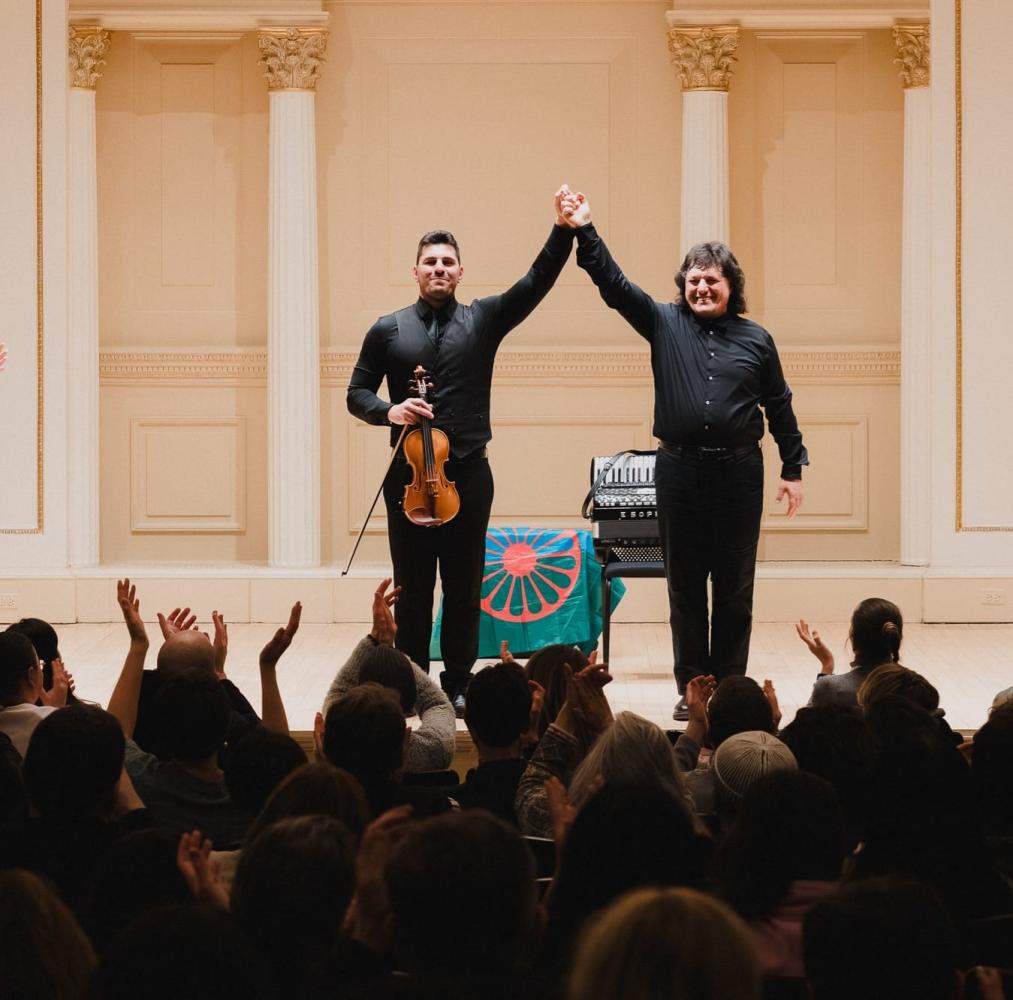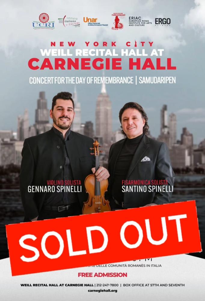 NEW YORK. È stato un successo straordinario il Concert for the Day of Remembrance / Samudaripen, che si è tenuto ieri sera, 2 febbraio 2026, nella prestigiosa Carnegie Hall di New York. L’evento, promosso e organizzato dalla Union of Roma Communities in Italy (UCRI) in occasione della Giornata Internazionale della Memoria, ha registrato il tutto esaurito e un pubblico profondamente coinvolto, che ha tributato agli artisti lunghi applausi e una commossa standing ovation finale. Protagonisti dell’evento sono stati i due artisti di fama internazionale Gennaro Spinelli, violino solista, e Santino Spinelli, fisarmonica solista, accompagnati da alcuni elementi dell’Orchestra Europea per la Pace. Il progetto etno-sinfonico ha saputo intrecciare repertorio classico rivisitato, musica tradizionale romanì e composizioni originali, dando vita a un percorso sonoro intenso e carico di significato simbolico. L’emozione in sala è stata palpabile per tutta la durata del concerto, con momenti di profondo raccoglimento alternati a esplosioni di entusiasmo.