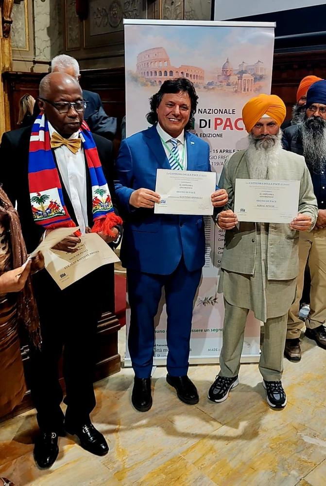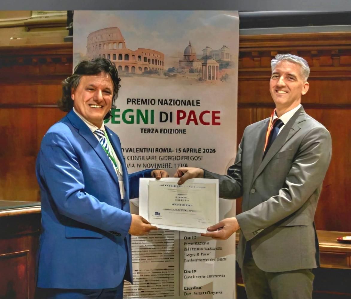 ROMA 15 aprile 2026, nella prestigiosa cornice della Sala Consiliare della Provincia nel Palazzo Valentini a Roma si è svolta una suggestiva cerimonia internazionale nel corso della quale al Commendatore Santino Spinelli è stato insignito del Diploma Onorifico di “Segno di Pace”, quale ulteriore riconoscimento per l’alto valore umano, civile e culturale della sua testimonianza. Il riconoscimento è stato conferito dalla Cattedra della Pace di Assisi, ente capofila del Comitato promotore della Terza Edizione del Premio Nazionale “Segni di Pace 2026”. A consegnare il diploma il direttore Renato Ongania.