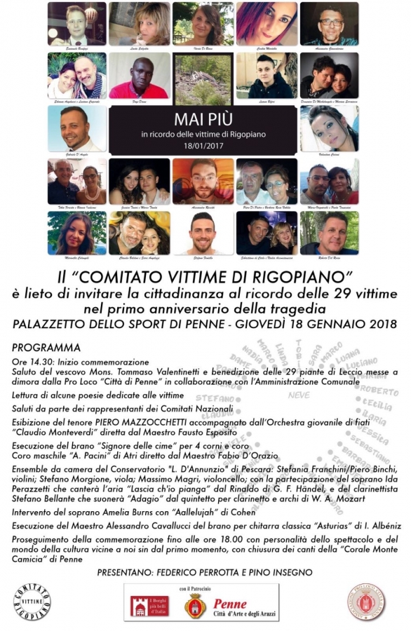 Il Comitato Vittime Rigopiano è lieto di invitarVi alla commemorazione che si svolgerà presso il Palazzetto dello Sport di Penne il giorno 18 gennaio p.v., alle ore 14:30 in occasione del primo anniversario della tragedia che ha colpito le nostre famiglie. A detta cerimonia saranno presenti sua Eccellenza Mons. Tommaso Valentinetti Arcivescovo di Pescara, l’orchestra “C. Monteverdi” di Ripa Teatina e altre personalità dello spettacolo e del mondo della cultura che ci sono state vicino sin dal primo momento. I familiari delle vittime si riuniranno già dal mattino a Farindola, per recarsi a Rigopiano al fine portare un fiore e una preghiera nel luogo in cui un anno fa hanno perso la vita i propri cari, successivamente, partendo alle 10.30 dal bivio Mirri di Farindola, con una fiaccolata giungeranno fino alla chiesa parrocchiale per assistere alla Santa Messa tenuta da Mons. Valentinetti. Confidando nella Vostra partecipazione e ringraziandovi anticipatamente per tutto quello che in questo anno avete fatto per noi, si porgono i più distinti saluti.