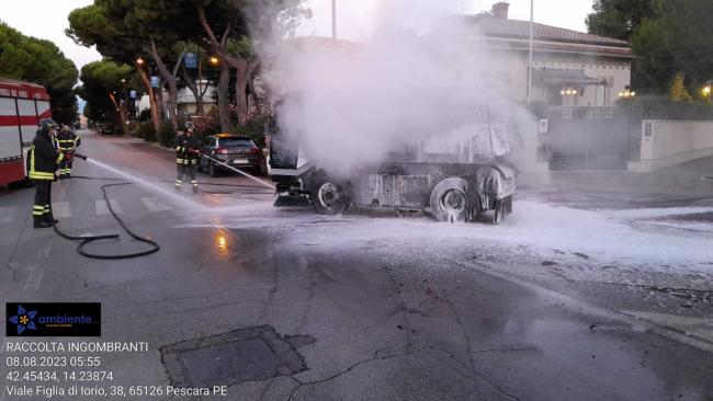 Nella mattinata di oggi, lunedì 8 agosto intorno alle ore 5:30 nella zona sud di Pescara in Via Figlia di Jorio angolo Via D'Annunzio un mezzo spazzatrice di Ambiente si è incendiato durante la pulizia delle strade cittadine.
