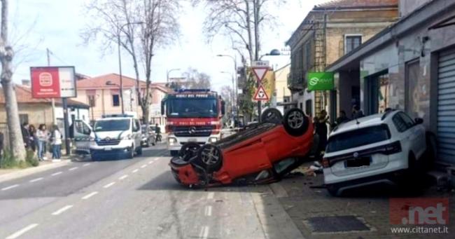 Paura in via Tiburtina nella mattinata di oggi, 5 aprile. Una Hyundai di colore rosso, condotta da una donna, per cause ancora da verificare è andata improvvisamente a sbattere contro due auto posteggiate lungo la strada, ribaltandosi.