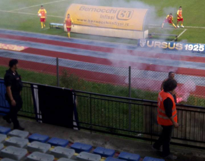 Bruttissimo episodio a Francavilla durante la partita di Eccellenza tra la squadra locale e l'Us San Salvo. Un tifoso locale alla fine del primo tempo ha scavalcato la recinzione del proprio settore, attraversato tutto il campo e lanciato un fumogeno contro la tifoseria sansalvese.