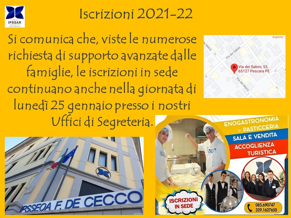 “L’Istituto Alberghiero Ipssar ‘De Cecco’ di Pescara ha chiuso la campagna di iscrizioni al prossimo anno scolastico con un numero di nuovi studenti sostanzialmente pari allo scorso anno e, anzi, con la potenzialità di istituire due nuove classi prime rispetto al 2020. Non ce lo aspettavamo, stando ai dati nazionali, regionali, e alla congiuntura negativa determinata dalla pandemia che ha penalizzato le scuole che hanno nei laboratori il proprio cuore pulsante. Ma di nuovo l’elevata qualità formativa offerta dai nostri spazi e dai nostri docenti, lo stesso livello organizzativo che ci ha permesso di lavorare anche in tempo di Covid sono gli elementi che come sempre hanno fatto la differenza.