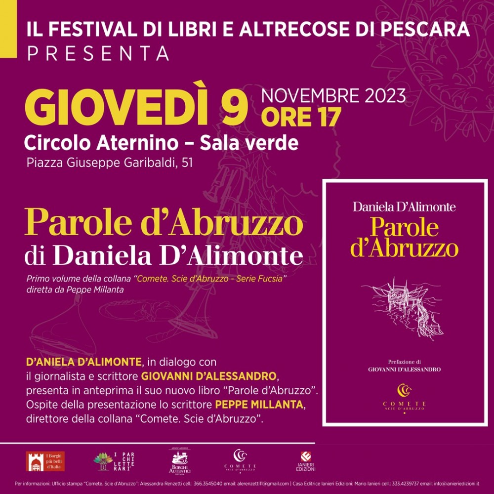 E' in uscita "Parole d'Abruzzo" di Daniela D'Alimonte: la nuova serie di Ianieri Edizioni targata "Comete. Scie d'Abruzzo", collana di 36 volumi diretta dallo scrittore Peppe Millanta; questa nuova serie sull'Abruzzo immateriale (sarà di colore fucsia) inizierà il suo tour proprio dal Fla di Pescara, giovedì 9 novembre alle ore 17.00 presso la Sala Verde del Circolo Aternino, piazza Giuseppe Garibaldi, 51. Modera il giornalista e scrittore Giovanni D'Alessandro che ha scritto la prefazione. Sarà ospite Millanta per il quale "scavare nelle parole, ricercare la loro origine, arrivare alla loro fonte, significa confrontarsi e mettersi in contatto con quello che siamo stati", dunque anche la parola dice tantissimo sulla storia di un passato che va riscoperto e che inevitabilmente proietta verso il futuro.