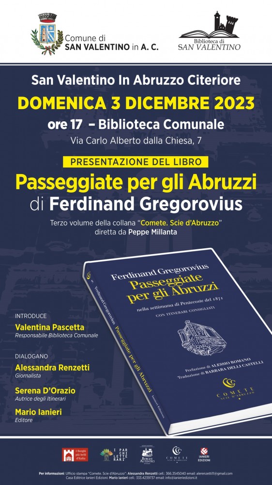 Introduce la Responsabile della Biblioteca Comunale, Valentina Pascetta. A presentare il nuovo volume che risulta essere il terzo della serie blu dedicata alla narrativa di viaggio in Abruzzo, sarà la giornalista abruzzese Alessandra Renzetti con l'editore Mario Ianieri e Serena D'Orazio, autrice degli itinerari della collana. La prefazione del volume è di Alessio Romano, mentre la traduzione è della Professoressa Barbara Delli Castelli.