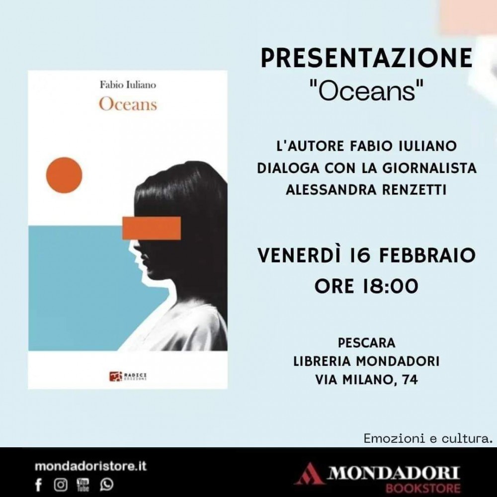 La Mondadori di Pescara (via Milano) ospita la presentazione di Oceans (Radici edizioni), il nuovo romanzo dell’autore e giornalista Fabio Iuliano; l'appuntamento è per venerdì 16 febbraio alle ore 18.00. Modera la giornalista pescarese Alessandra Renzetti.