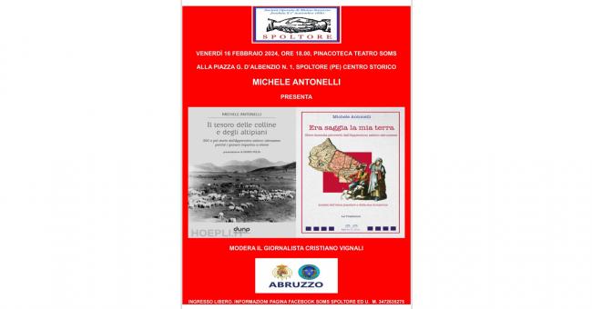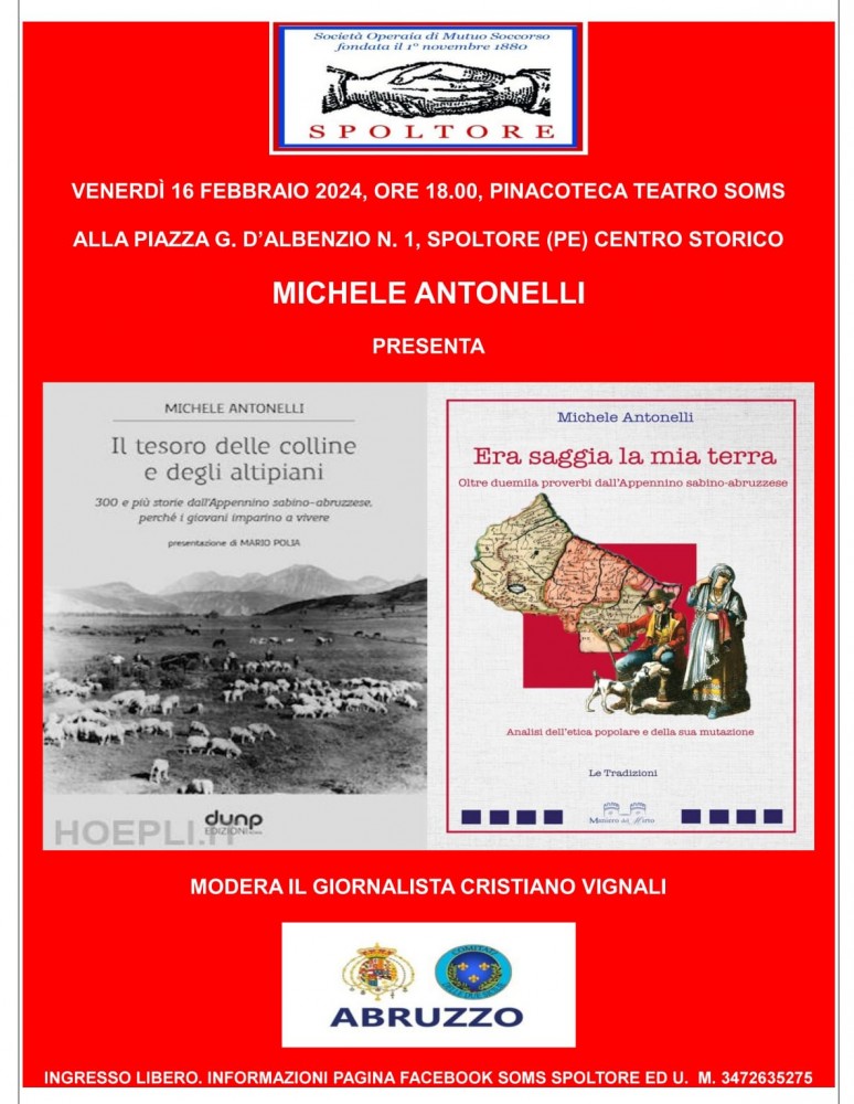 Nel pomeriggio di venerdì 16 febbraio, a partire dalle ore 18, Michele Antonelli, originario di Montereale, presenterà due suoi volumi per la tutela dell'identità storica della sua terra, dell'antica civiltà dell'Appennino Centrale "Il Tesoro delle Colline e degli Altipiani. 300 e più storie dell'Appennino sabino-abruzzese, perché i giovani imparino a vivere" (Dunp Edizioni) e "Era Saggia La Mia Terra. Oltre duemila proverbi dall'Appennino sabino-abruzzese. Analisi dell'etica popolare e della sua mutazione" (Edizioni Maniero del Mirto, collana Le Tradizioni), presso la Pinacoteca della Società Operaia Mutuo Soccorso (Soms) di Spoltore, sodalizio presieduto dall'avvocato Luigi Spina. Modera l'evento il giornalista Cristiano Vignali. L'evento è patrocinato dai Comitati Due Sicilie.