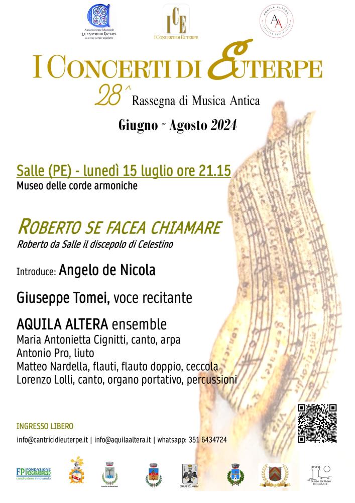 Nel testo, ideato e interpretato da Giuseppe Tomei, il beato Roberto narra la sua vita rievocando i momenti più salienti e intimi del suo percorso spirituale, ma anche terreno, che lo condussero a divenire un seguace fedele di Celestino V, abbracciandone gli insegnamenti ed entrando nella congregazione dei Celestini dell'ordine benedettino. L'ensemble Aquila Altera, Maria Antonietta Cignitti, canto e arpa, Antonio Pro, liuto, Matteo Nardella, flauti, flauto doppio, flauto e tamburo, ceccola, Lorenzo Lolli, canto, organo portativo, percussioni, arricchirà la narrazione dello spettacolo con brani vocali e strumentali del XIII e del XIV secolo, selezionati dal Laudario di Cortona, dalle Cantigas de Santa Maria, dai Carmina Burana e dal codice di Londra. Per informazioni: info@cantricidieuterpe.it; info@aquilaaltera.it; cell.351 6434724.