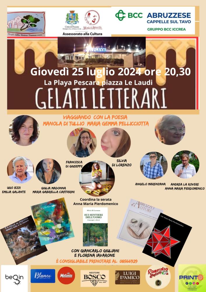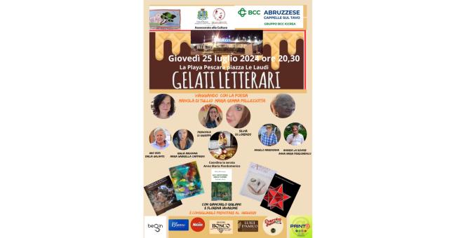 Continuano i giovedì culturali di Pescara con i Gelati Letterari, la VII edizione nella splendida cornice del complesso balneare La Playa in piazza Le Laudi. Il quarto appuntamento è in programma giovedì 25 luglio sempre alle ore 20,30 con il patrocinio dell’assessorato alla cultura del Comune di Pescara e organizzato dall'associazione culturale I Borghi della Riviera Dannunziana.