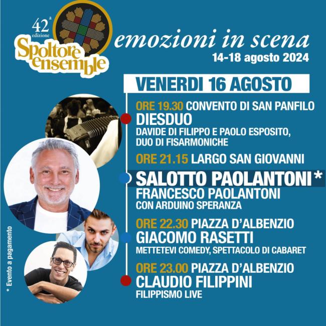 Alle ore 21:15, largo San Giovanni ospiterà "Salotto Paolantoni", uno spettacolo che vedrà protagonista Francesco Paolantoni, affiancato da Arduino Speranza. Il duo condurrà il pubblico in un viaggio tra aneddoti, comicità e riflessioni, trasformando la piazza in un salotto a cielo aperto dove l’ironia e l’intelligenza delle battute si mescoleranno con il piacere della condivisione.