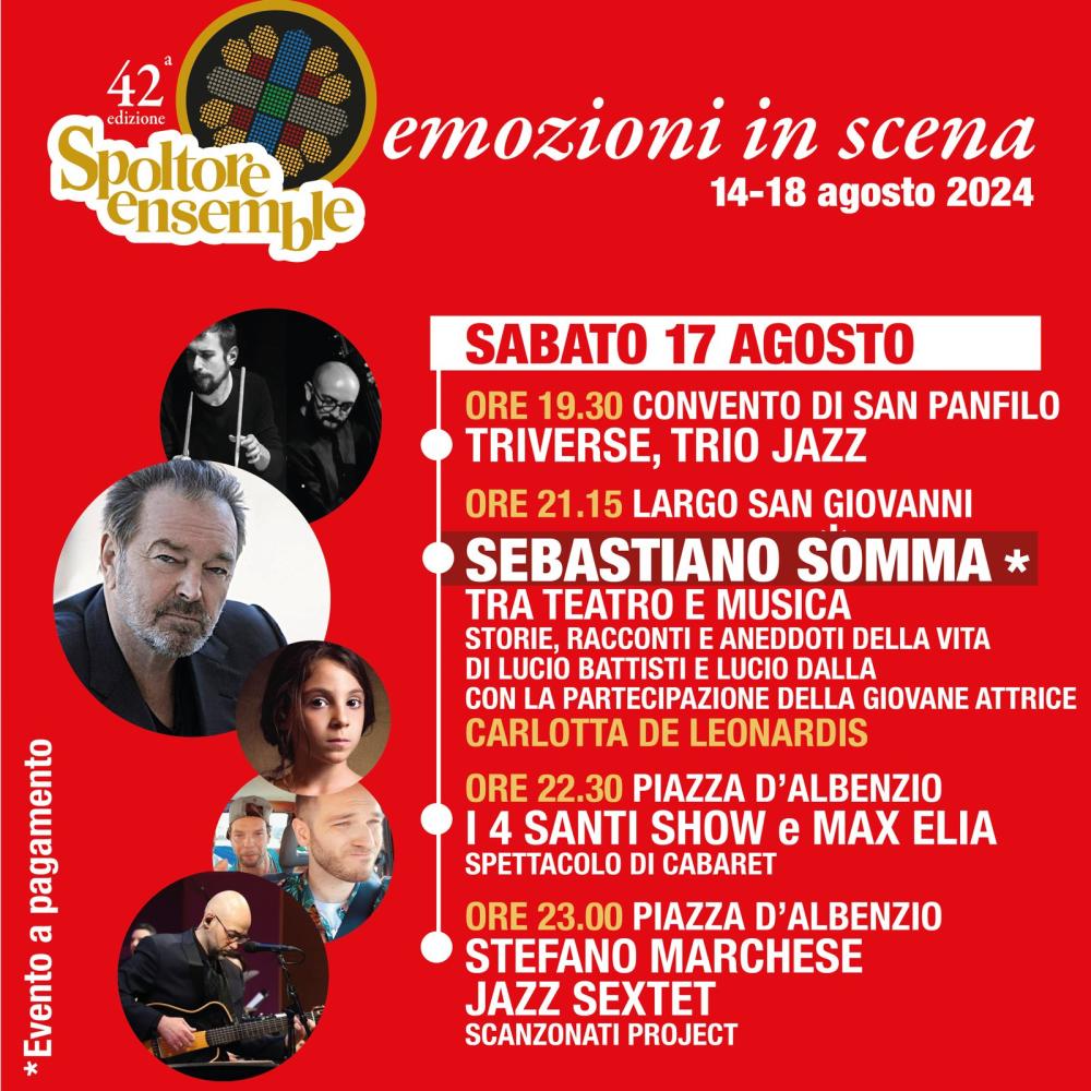 Proseguendo, alle ore 21:15, largo San Giovanni ospiterà "Tra Teatro e Musica", uno spettacolo con Sebastiano Somma che racconterà le storie e gli aneddoti della vita di due grandi protagonisti della musica italiana: Lucio Battisti e Lucio Dalla. Affiancato dalla giovane attrice Carlotta De Leonardis, Somma guiderà il pubblico in un viaggio emozionante tra parole e note, evocando i momenti più significativi della carriera e della vita dei due artisti.