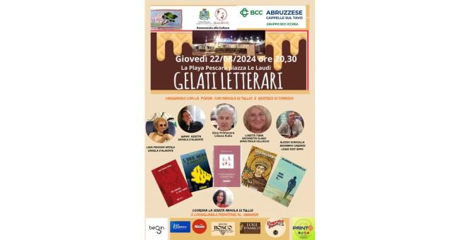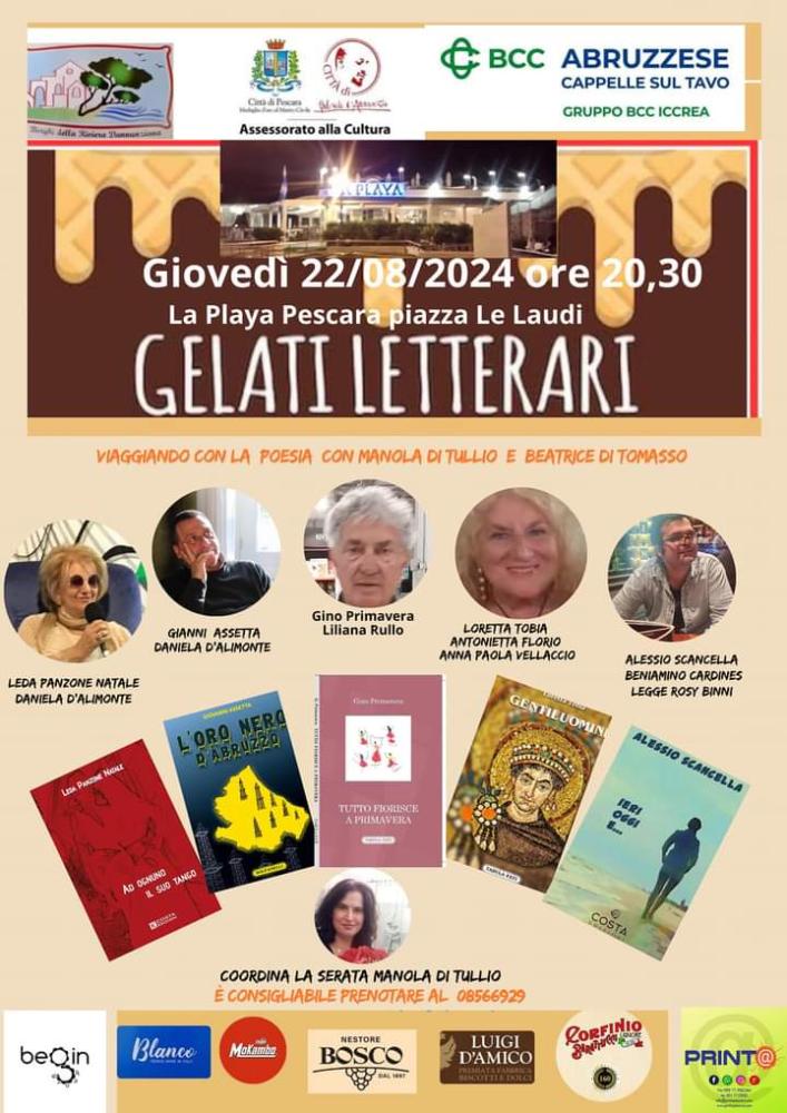 A Pescara ultimo appuntamento per questa estate 2024 con i Gelati Letterari, VII edizione, nella splendida cornice del complesso balenare La Playa in piazza Le Laudi. Giovedì 22 agosto, sempre alle ore 20,30 con il patrocinio del vice sindaco e assessore alla Cultura del Comune di Pescara Maria Rita Carota. Organizza l'associazione culturale I Borghi della Riviera Dannunziana. Torna ‘Viaggiare con la poesia’ che vedrà, insieme a Manola Di Tullio, la presenza di Beatrice Di Tomasso.