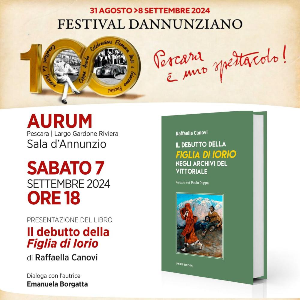 Nell'ambito del Festival dannunziano di Pescara, sabato 7 settembre alle ore 18 presso la Sala d'Annunzio dell'Aurum, ci sarà la presentazione del libro "Il debutto della Figlia di Iorio negli Archivi del Vittoriale" (Ianieri edizioni) di Raffaella Canovi, introduce Emanuela Borgatta.