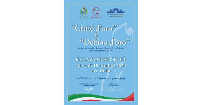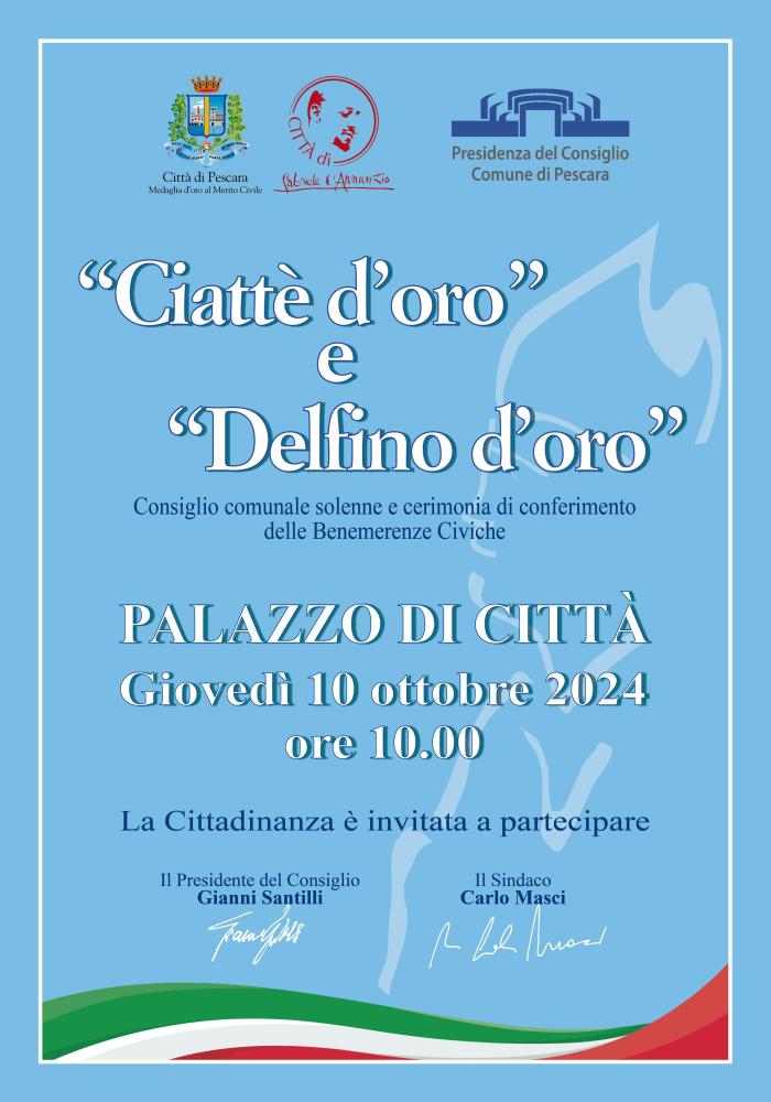 "I riconoscimenti del Comune sono i riconoscimenti della città intera – commenta il sindaco Carlo Masci – a chi si è distinto o si distingue nei campi più svariati, portando in alto il nome di Pescara, ben oltre i confini geografici. Sono orgoglioso di consegnare ancora una volta il  “Ciattè d’oro”, il “Delfino d’oro” e le "Menzioni" a chi ama Pescara. I premiati, quelli passati, quelli di quest'anno e quelli futuri, rappresentano, in realtà, una piccola flotta, ben più consistente, composta da tutte quelle persone che idealmente dovrebbero ricevere questo riconoscimento perché si distinguono, con impegno e dedizione, ma lontano dai riflettori. A tutti va il mio grazie per ciò che fate".