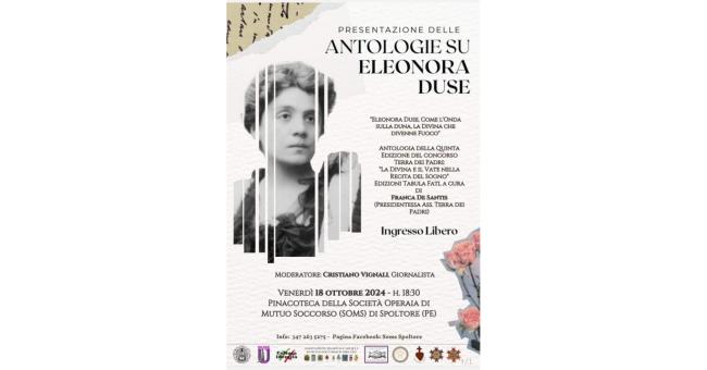 Oggi pomeriggio alle ore 18.30 si terrà , presso la pinacoteca della Società Operaia di Mutuo Soccorso di Spoltore, nell'ambito delle celebrazioni del Centenario della scomparsa di Eleonora Duse, la presentazione di due antologie, edite da "Tabula Fati" di Marco Solfanelli , sulla "Divina Musa" di Gabriele d'Annunzio, realizzate nell'ambito del progetto UNDULNA, l'antologia "Eleonora Duse, Come l'Onda sulla Duna, la Divina che divenne fuoco" e l'antologia della quinta edizione del concorso Terra dei Padri "La Divina e il Vate nella Recita del Sogno".