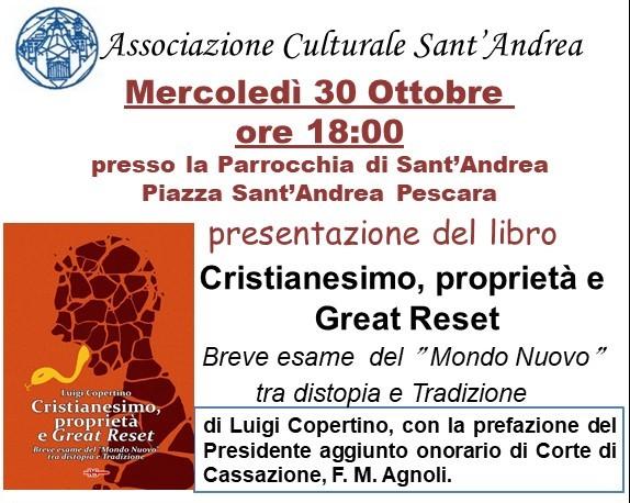 Mercoledì 30 ottobre alle ore 18 verrà presentato il libro “Cristianesimo, proprietà e Great Reset - Breve esame del Mondo Nuovo tra distopia e Tradizione” di Luigi Copertino, con la prefazione del Presidente aggiunto onorario di Corte di Cassazione, F. M. Agnoli, presso la Sala Parrocchiale di Sant’Andrea in Piazza Sant’Andrea. Il libro affronta uno degli argomenti più attuali e scottanti di questa fase storica che rappresenta una delle più interessanti letture critiche del fenomeno del “Grande Reset”, il radicale cambiamento dello scenario economico e politico mondiale avviato in occasione della pandemia.
