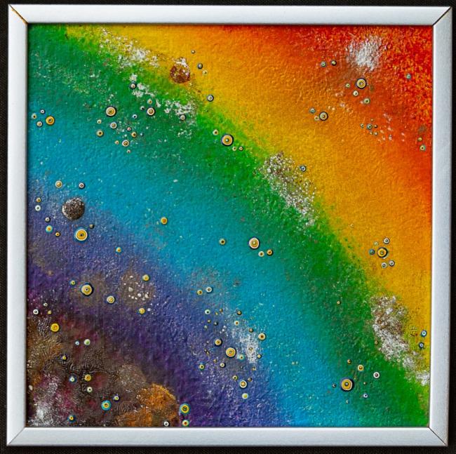 E ancora: “Una pittura cosmica, universale e luminosa, in cui la mente e il cuore viaggiano nell’infinità di galassie, stelle e pianeti fino a librarsi nel cielo color rosso arancione dell’opera “Vita nel nuovo mondo” oppure nel cielo verde di “Astronavi su crateri”; lo sguardo si inebria della meravigliosa visione delle stelle, per poi andare ancora oltre, là dove la materia si tramuta in pura energia spirituale che si tinge di colori simili a quelli dell’arcobaleno come in “Lives in the rainbow”; colori che delicatamente ci accarezzano e ricordano la nostra vera natura, divina e immortale, partecipe dell’armoniosa sintesi tra il micro e il macrocosmo, tra la materia e lo spirito, tra la ragione e il sentimento, tra la luce e l’ombra”.