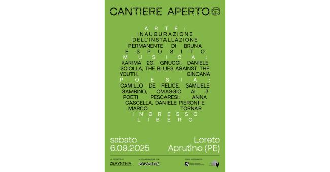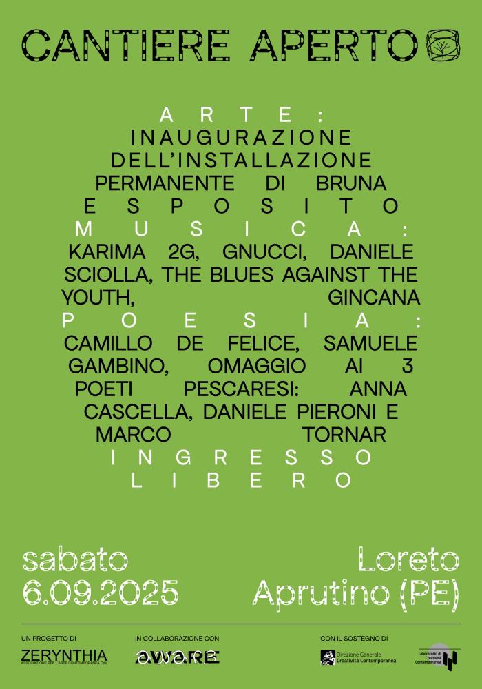 Sabato 6 settembre, dalle 12 alle 18, torna Cantiere Aperto, alla sua terza edizione, presso No Man’s Land in contrada Rotacesta a Loreto Aprutino. Per il terzo anno consecutivo, arte contemporanea, musica e poesia si intrecciano in una giornata di condivisione collettiva, in un luogo che si propone come spazio aperto, accogliente e partecipato. Il festival è promosso dalla Fondazione No Man’s Land e curato da Zerynthia – Associazione per l’Arte Contemporanea OdV, in collaborazione con Aware – Bellezza Resistente e con il patrocinio del Comune di Loreto Aprutino. L’edizione 2025 è sostenuta dal Laboratorio di Creatività Contemporanea e promossa dalla Direzione Generale Creatività Contemporanea del Ministero della Cultura.
