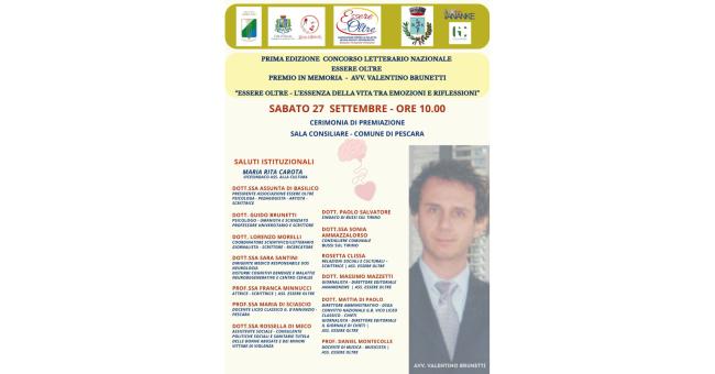 Sabato 27 settembre alle ore 10, nella Sala Consiliare del Comune di Pescara, si terrà la cerimonia di premiazione dei vincitori della Prima Edizione del Concorso Letterario Nazionale “Essere Oltre”, intitolato Premio in memoria dell’avvocato Valentino Brunetti, di origini abruzzesi, scomparso nel 2024 a soli 53 anni. Ha lasciato i genitori, Guido e Anita, e il fratello Marcello, dirigente medico dell'ospedale di Pescara.