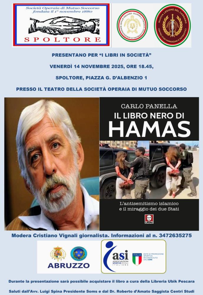 Nel pomeriggio di venerdì 14 novembre, dalle ore 18.45 le grandi questioni della politica e delle relazioni internazionali fanno tappa in Abruzzo e in particolare al Teatro della Società Operaia di Mutuo Soccorso (Soms) di Spoltore, tempio della cultura regionale, in Piazza G. D'Albenzio, dove sarà ospite il giornalista e scrittore Carlo Panella che presenterà: "Il Libro Nero di Hamas", edito dalla Lindau editore, su “L'antisemitismo islamico e il miraggio dei due Stati”.