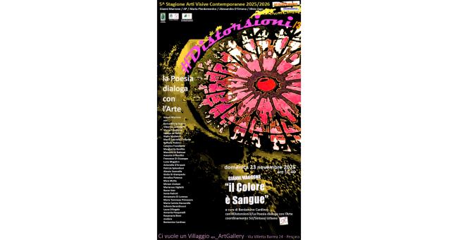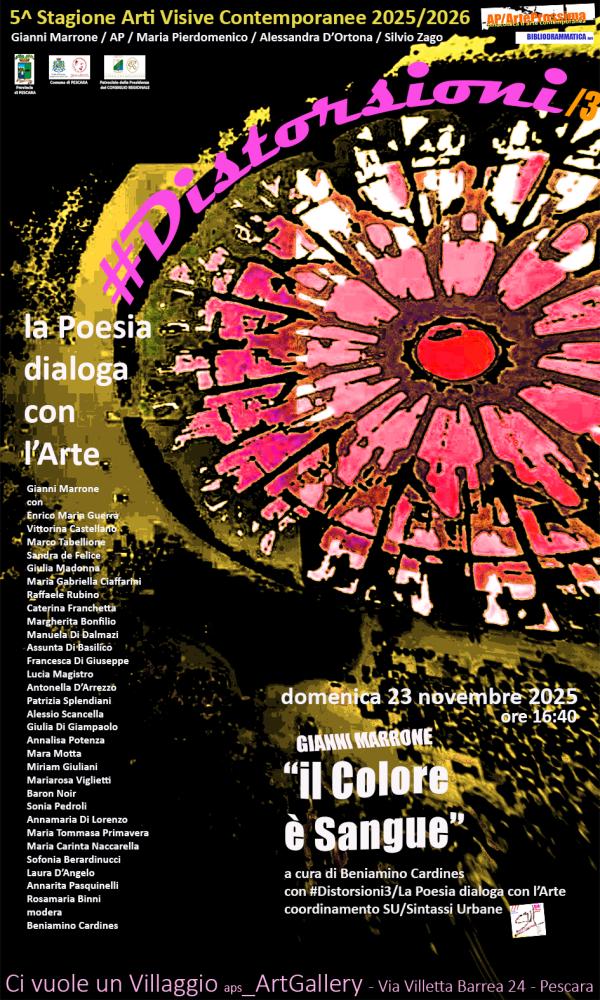 Domenicav23 novembre ore 16:40, primo appuntamento con il progetto #DISTORSIONI/3 – La Poesia dialoga con l’arte nell’ambito della 5^ Stagione Arti Visive Contemporanee presso “Ci vuole un villaggio aps_ArtGallery” (Via Villetta Barrea 24 - Pescara). Patrocino della Presidenza del Consiglio Regionale. Patrocinio delComune di Pescara e della Provincia di Pescara.