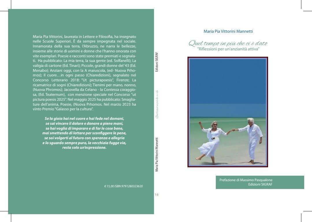 Per le edizioni Sigraf di Pescara è in uscita il libro di Maria Pia Vittorini Mannetti, "Quel tempo in più che ci è dato - riflessioni per un'anzianità attiva", con la prefazione di Massimo Pasqualone. Maria Pia Vittorini, laureata in Lettere e Filosofia, ha insegnato nelle scuole superiori. È da sempre impegnata nel sociale. Innamorata della sua terra, l’Abruzzo, ne narra le bellezze, insieme alle storie di uomini e donne che l’hanno onorata con vite esemplari. Poesie e racconti sono state premiati e segnalati.