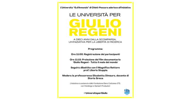 L'Università degli Studi "Gabriele d'Annunzio" di Chieti-Pescara annuncia la propria adesione ufficiale a “Le Università per Giulio Regeni”, l’importante iniziativa nazionale promossa dalla Senatrice a vita e scienziata, Elena Cattaneo, per onorare la memoria del giovane ricercatore, a dieci anni dalla sua scomparsa in Egitto. Nell’ambito di questo progetto, che coinvolge 76 atenei italiani e oltre 15.000 persone, la "d'Annunzio", lunedì 11 maggio, alle 11, ospiterà nell’Aula 31 del Campus di Pescara una proiezione speciale del documentario "Giulio Regeni - Tutto il male del mondo" (prodotto da Fandango e Ganesh Produzioni).