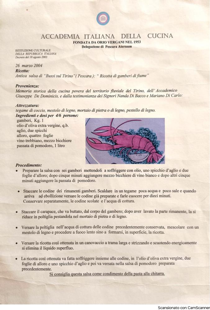 Gerardo Rasetta, accademico della delegazione Pescara Aternum sin dall’origine della istituzione pescarese, ha raccontato di come da ragazzo andava insieme a suo fratello a prendere i gamberi che usavano come esca per le trote. I gamberi erano tanti e si potevano prendere con le mani. Nel 2004 Pino De Dominicis e Luciana D’Aprile riscoprirono l’antica ricetta Ricotta di Gamberi che è parte di un patrimonio culturale gastronomico della Valle del Tirino ed è originale tipica di Bussi.