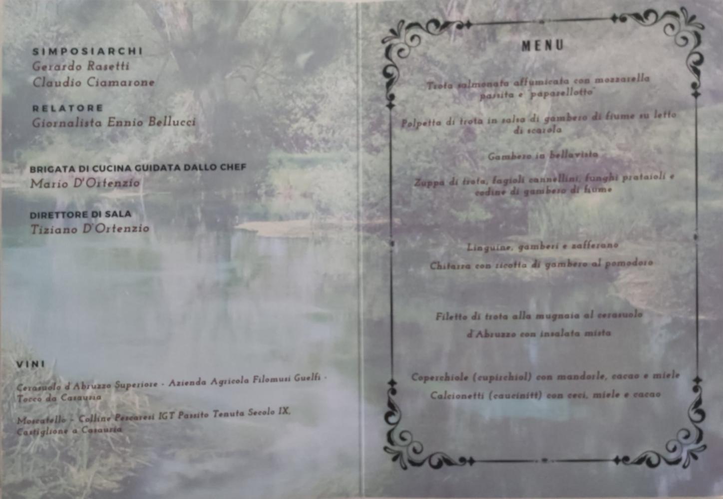 La descrizione e illustrazione del menu è stata fatta dai Simposiarchi Gerardo Rasetti Claudio Ciamarone che ne hanno curato la composizione con pietanze coerenti al tema della conviviale e nella tradizione del ristorante che da anni prepara e mantiene la tradizione storica del territorio di ricette a base di pesce di acqua dolce.